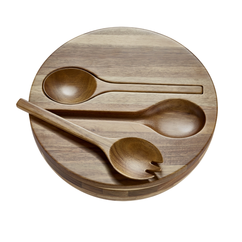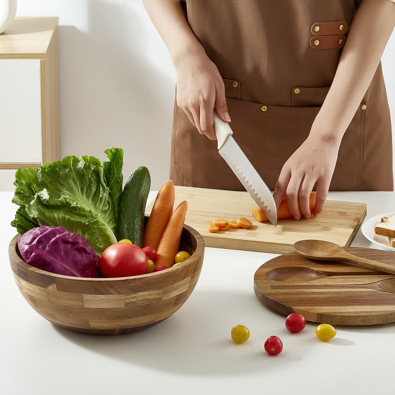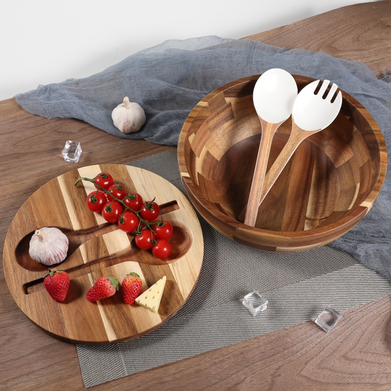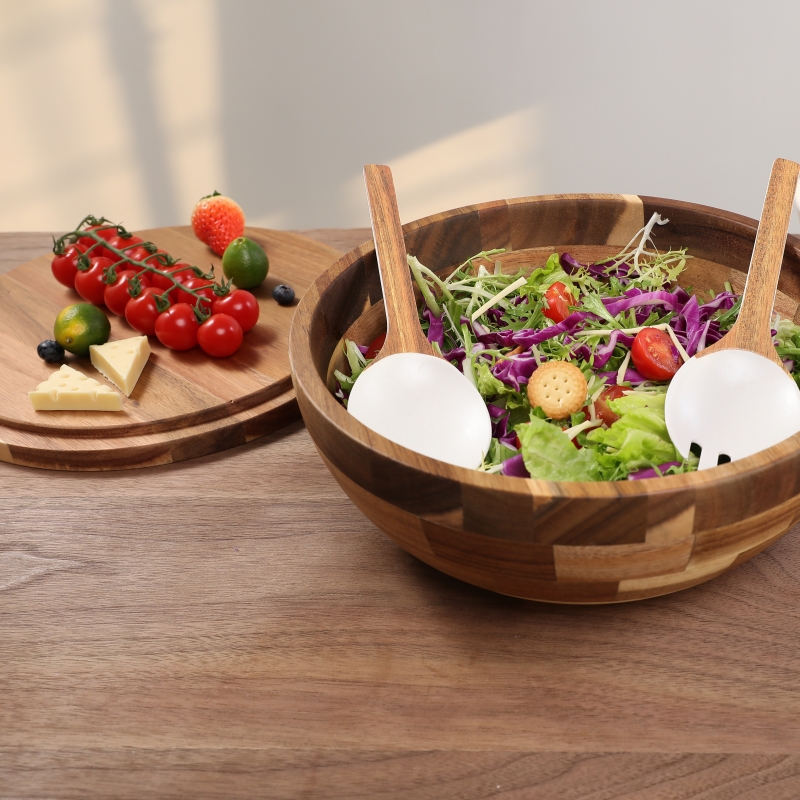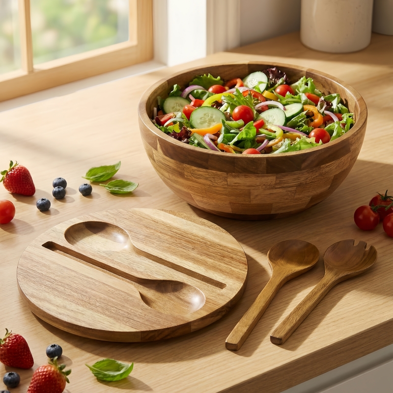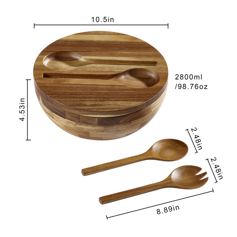 All-in-One Salad Bowl Set with Built-in Utensils: This 4-piece acacia wooden bowls set includes a 10.5-inch large bowl, a reversible acacia wood lid, a wooden fork, and a wooden spoon. The innovative design integrates the utensils into the lid, keeping everything organized and ensuring you never lose track of your serving tools. Perfect for salads, fruits, vegetables, pasta, and snacks, this set is a must-have for family dinners, picnics, and camping trips.