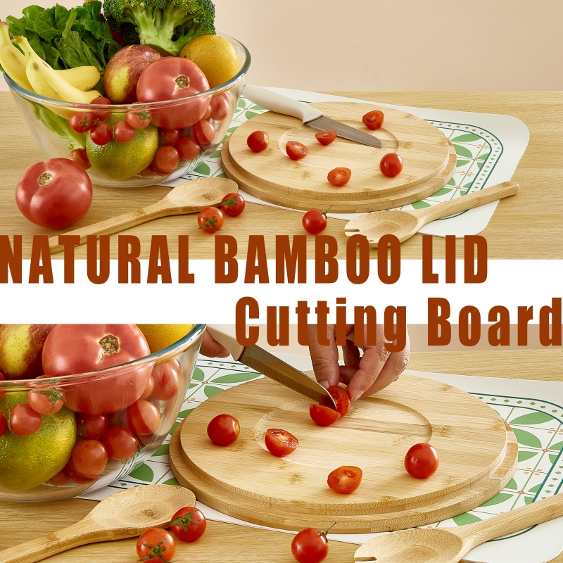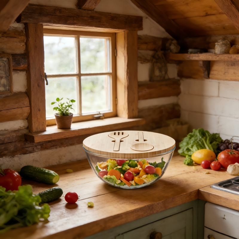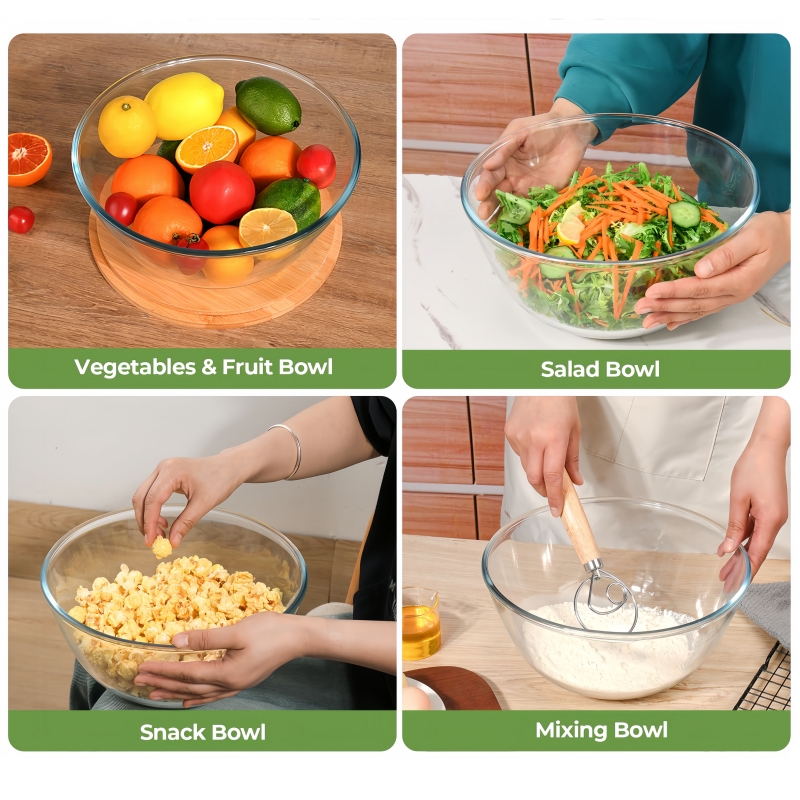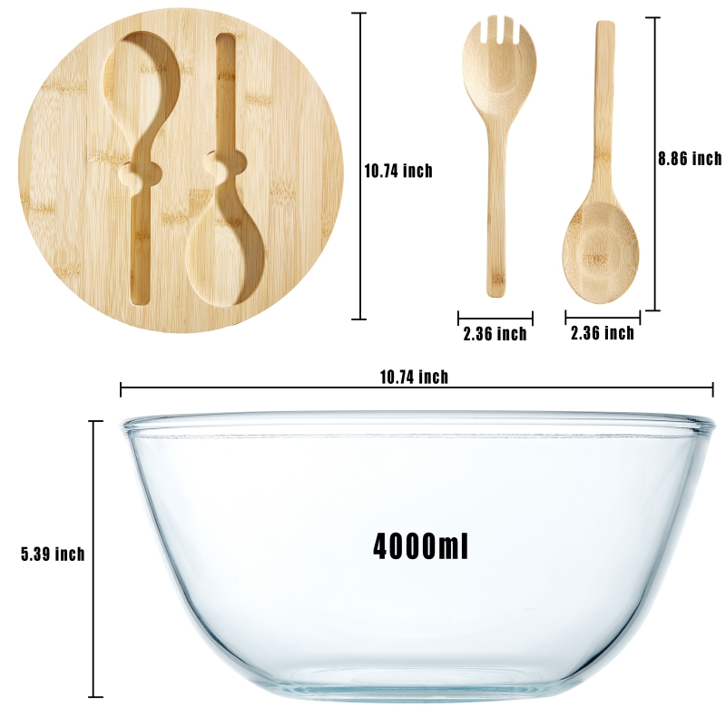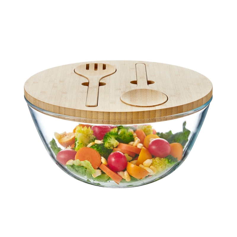 10.74 inch High Borosilicate Glass Salad Bowl With Bamboo Lid and Servers patent design