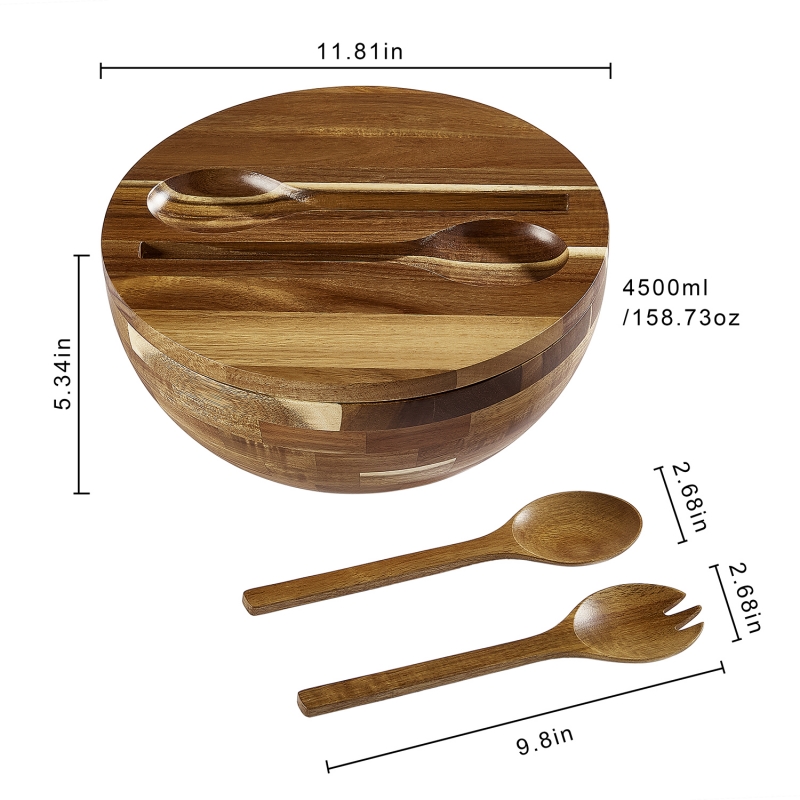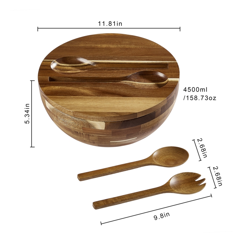 11.8 inch Acacia Wooden Salad Bowl with Lid, Built-in Acacia Wood Utensils Patent Design