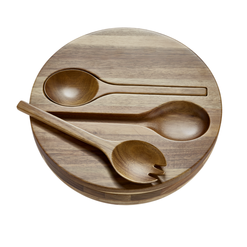 All-in-One Salad Bowl Set with Built-in Utensils: This 4-piece acacia wooden bowls set includes a 11.81-inch large bowl, a reversible acacia wood lid, a wooden fork, and a wooden spoon. The innovative design integrates the utensils into the lid, keeping everything organized and ensuring you never lose track of your serving tools. Perfect for salads, fruits, vegetables, pasta, and snacks, this set is a must-have for family dinners, picnics, and camping trips.
